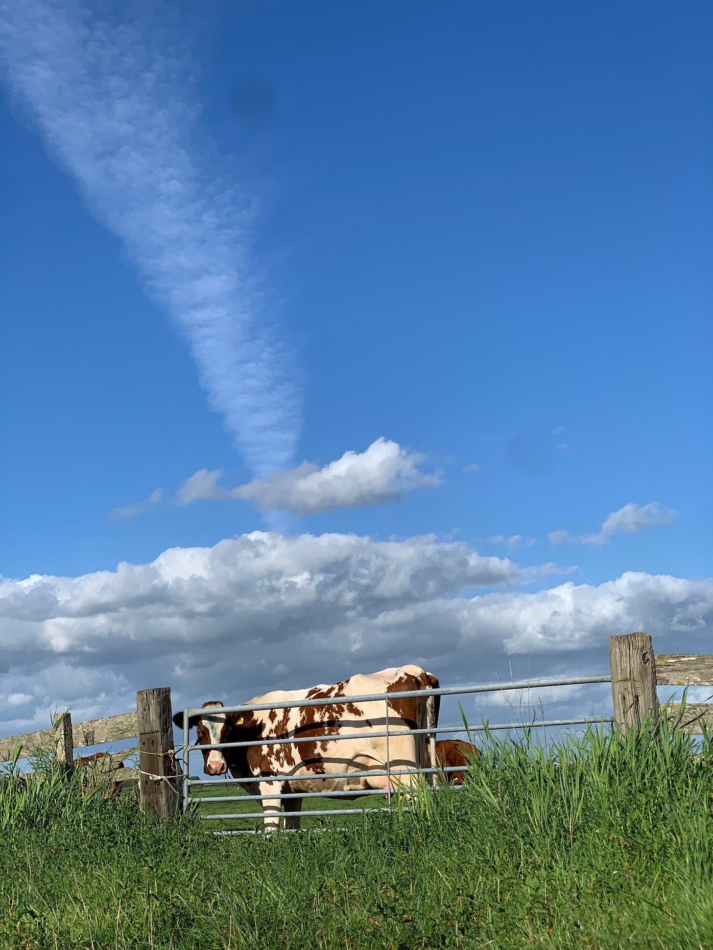 Purple plumed reeds bend under Lilian’s force, cavalier crickets chirp amongst wildflower stems, frothing waves lash the basalt dyke. I am lying in its shelter looking up at sky arcing blue and unbroken. A curious Friesian stares with watchful eyes, then scratches her rump on a metal gate with a clang. Sounds of my home: